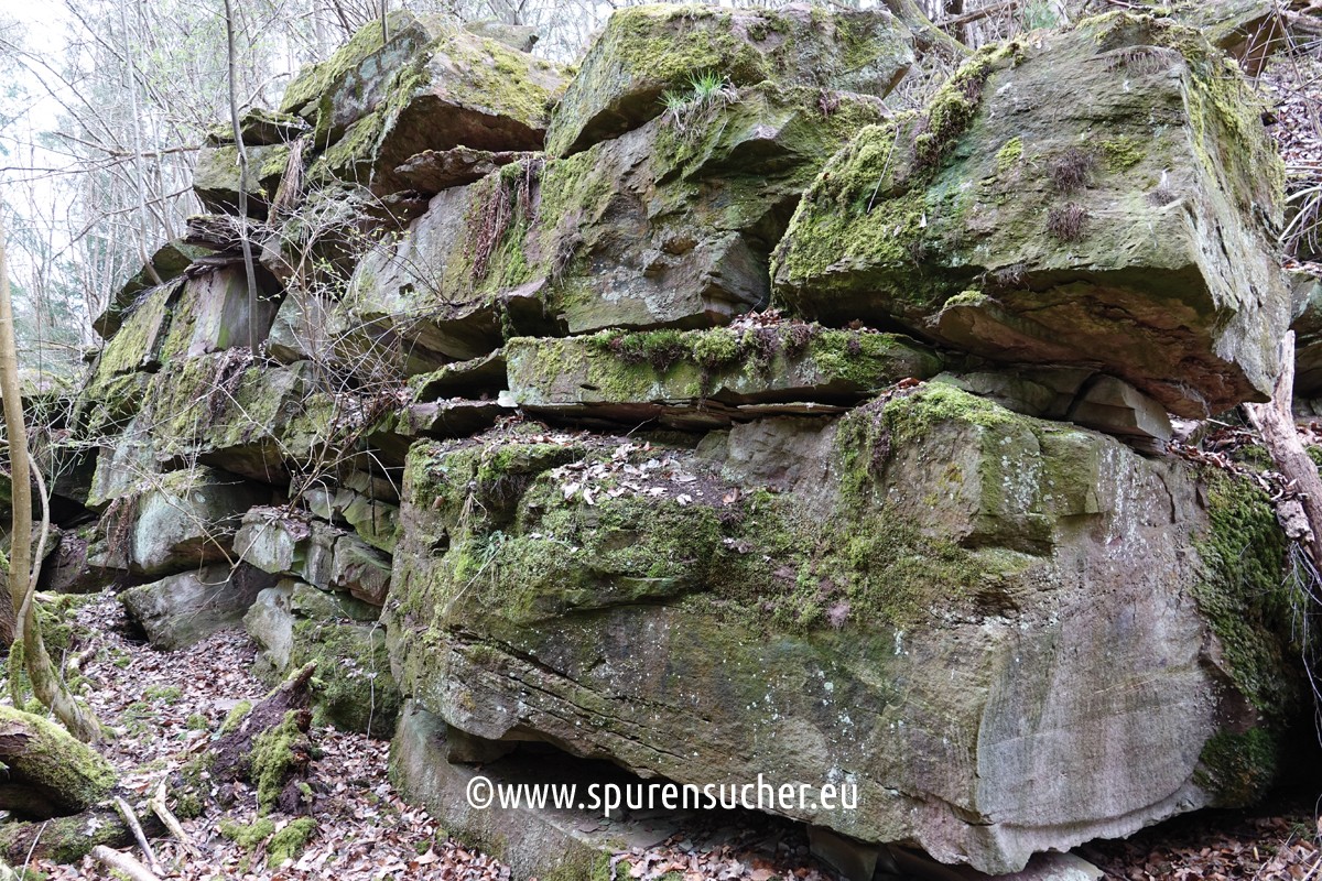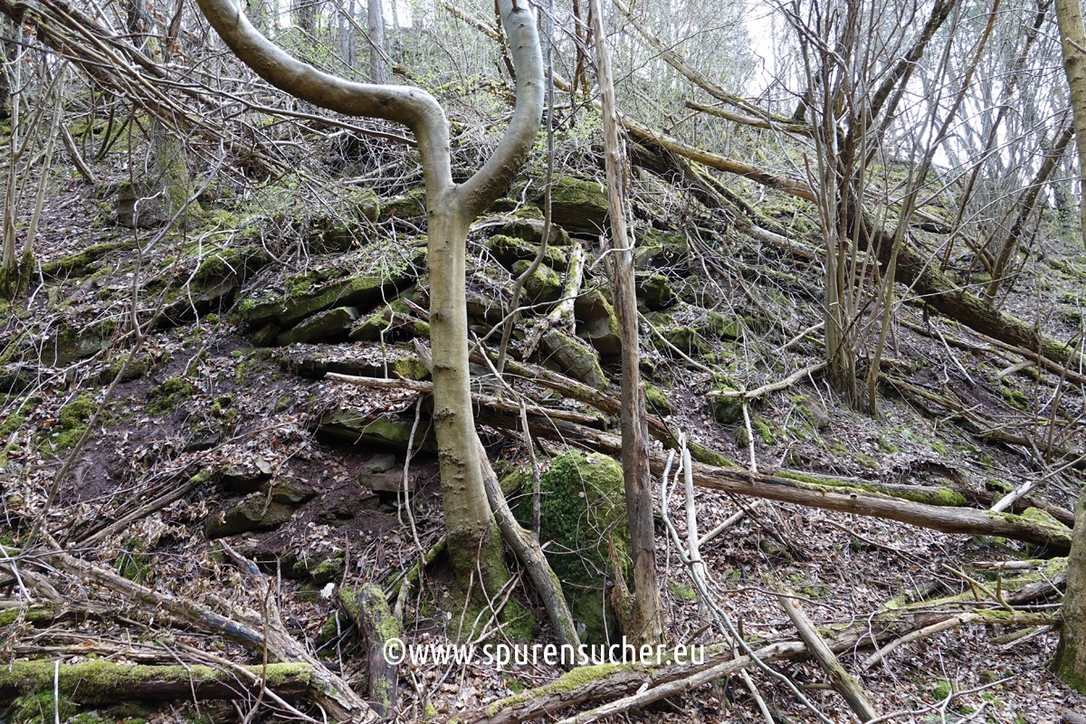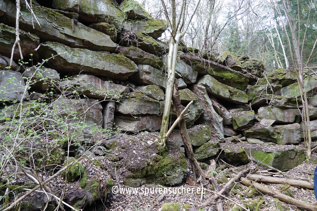 Die Felsen sind jeweils etwa bis zu 7 Metern hoch aufgetürmt und dienten sicherlich der Befestigung oder (vielleicht sogar nachträglichen) Tarnung einer Struktur, die man heute mit bloßem Auge nicht mehr kann. Die Reliefkarte des Geoportals Baden-Württemberg bestätigt den exponierten Bergrücken, lässt aber zunächst auch keine künstlichen Strukturen erkennen. Man muss schon vor Ort sein, um sich davon ein Bild davon zu machen.
