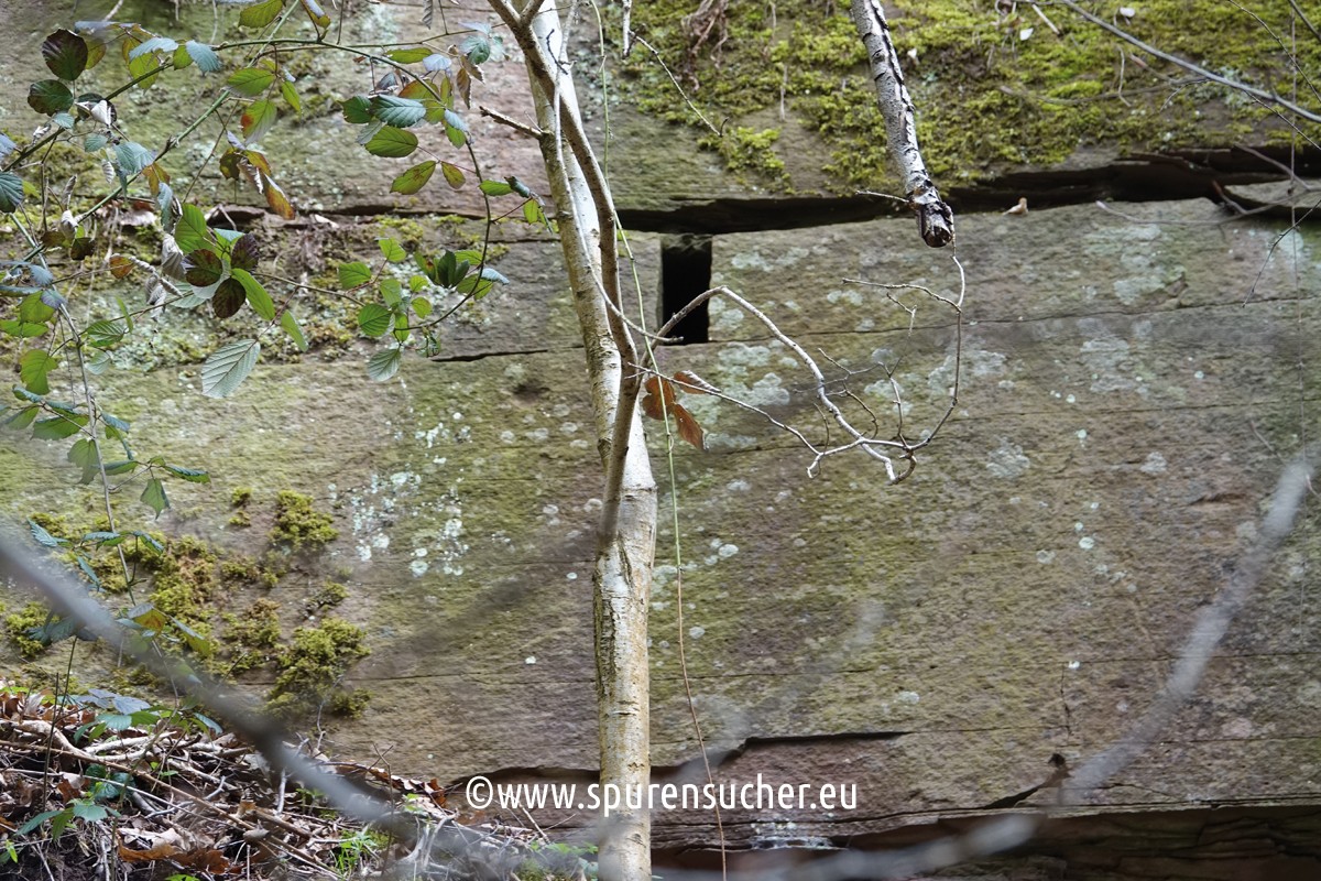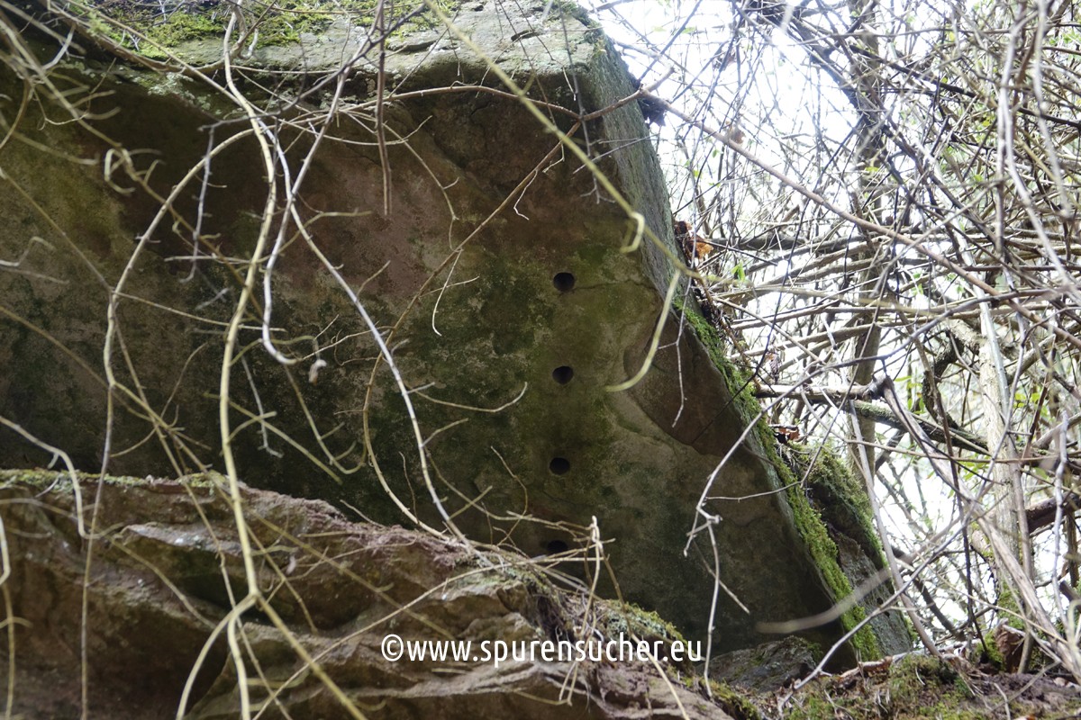 Symmetrische Bohrungen in etwa 6-8 Metern Höhe an der Unterseite eines vorstehenden (vermutlich bearbeiteten) Felsens. Sind dies die Bohrlöcher in Vorbereitung zu einem unvollendeten Abbruch? Diese sehen mir jedoch aus der Entfernung größer aus als die gemessenen 30-35 mm Durchmesser.