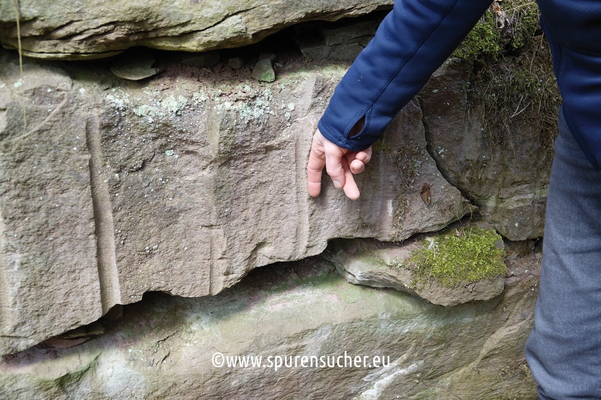 Mindestens an einer Stelle befindet sich ein Felsen, der dort geologisch nicht zur Sandstein-Anlage passt. Es handelt sich um Gneis, mittelharte Gesteinssorte (Mohshärte 3), ein vorläufiges Einzelexemplar. Das muss von außerhalb hergeschafft worden sein. Woher, ist erst einmal unbekannt. Ein absolutes Mysterium. Der Fund ist bereits von einer Geologin bestätigt worden.