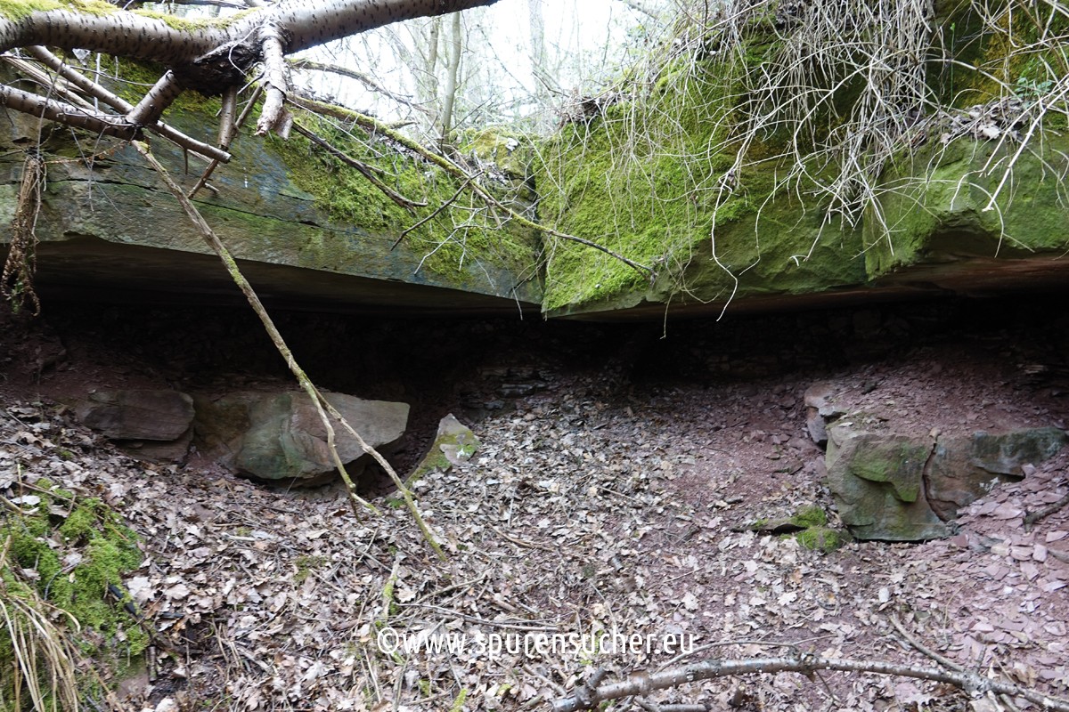 Am Rande der Anlage befindet sich eine merkwürdige Senke, bei der es sich ursprünglich um alles mögliche handeln könnte. Auszuschließen ist ein herausgezogener Baum, dafür ist das Loch vom Durchmesser zu groß und vor allem auch zu tief. Vielleicht war es einmal ein verborgener oder tiefgelegter Zugang, der nicht gründlich genug zugeschüttet wurde und wo die Erde langsam „nachsackt“.