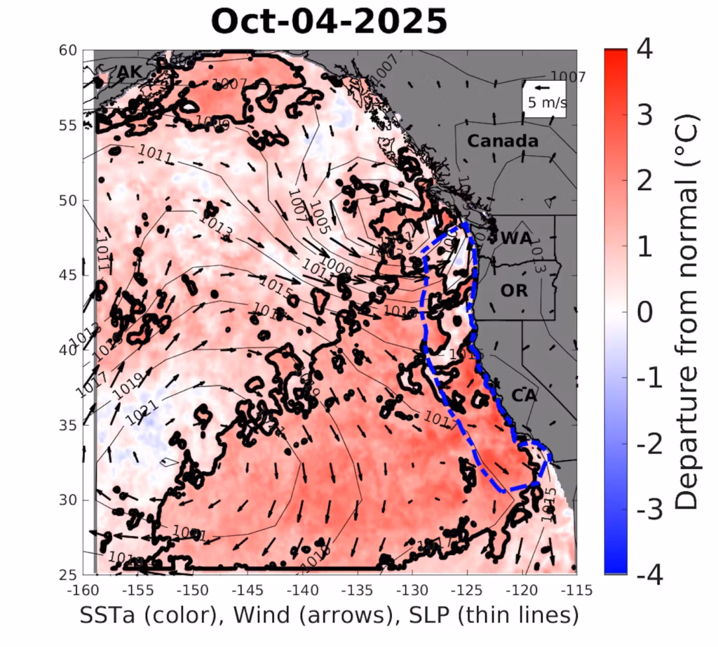 Titelbild: Am 4. Oktober 2025 erreichte ein ungewöhnlich warmer Wasserfleck (markiert durch dicke schwarze Linien) die Küsten Alaskas, British Columbias und Kaliforniens, blieb aber vor den meisten Teilen Oregons und Washingtons vor der Küste. Die ausschließliche Wirtschaftszone der USA ist durch die blaue gestrichelte Linie markiert.